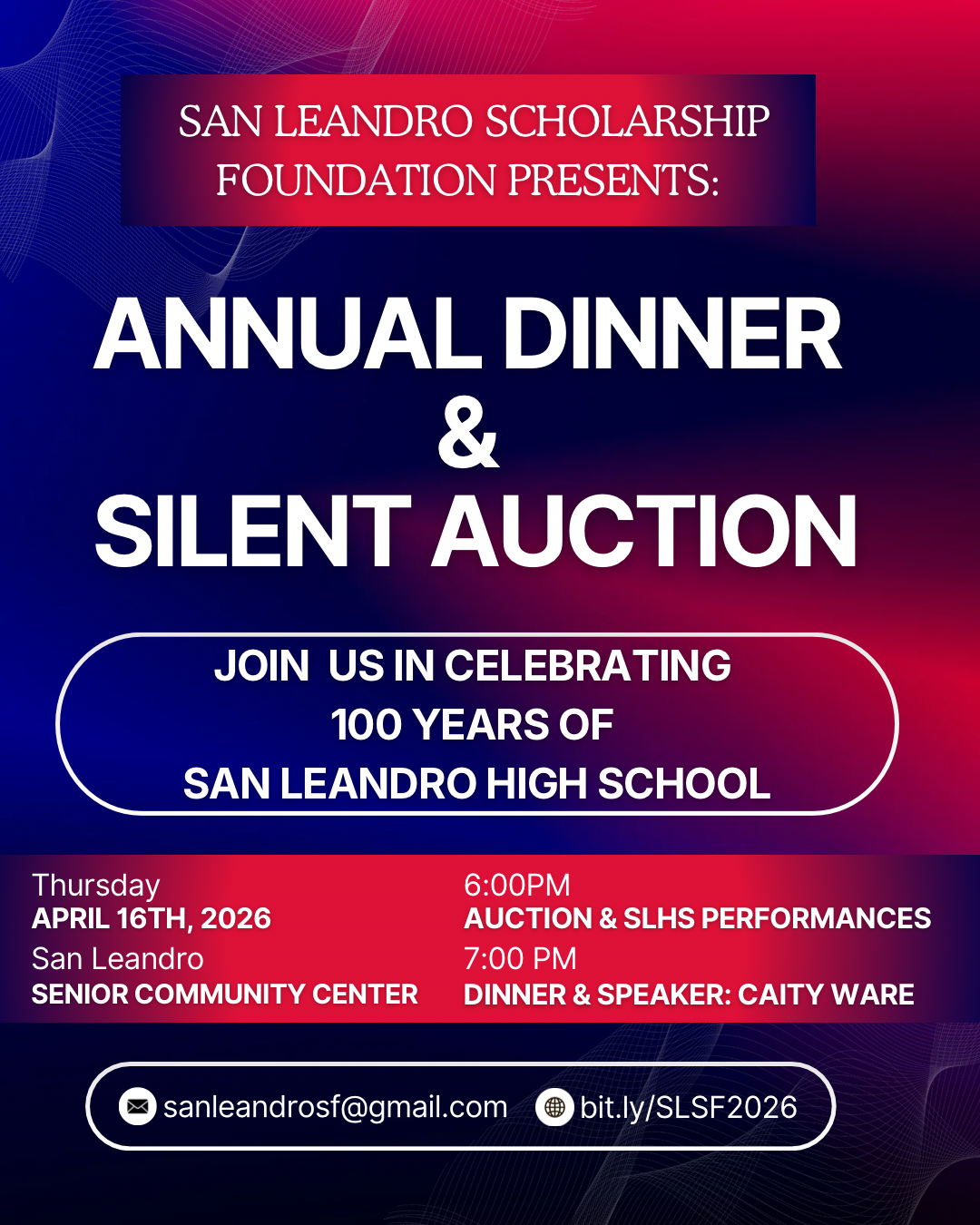 Founded in 1967, the San Leandro Scholarship Foundation (SLSF) is a 501(c)3 non-profit corporation that supports graduating seniors from our local San Leandro public high schools. We raise funds to grant scholarships to students headed to four-year universities, junior colleges, and trade schools. We encourage local businesses, community groups, service clubs and community members to contribute financial donations and to create specific annual scholarships that are distributed through the Foundation. 100% of donations and funds raised go towards the scholarships. In its first year, SLSF awarded a total of $1,690 in scholarships. We are currently awarding about $145,000 in scholarships each year.